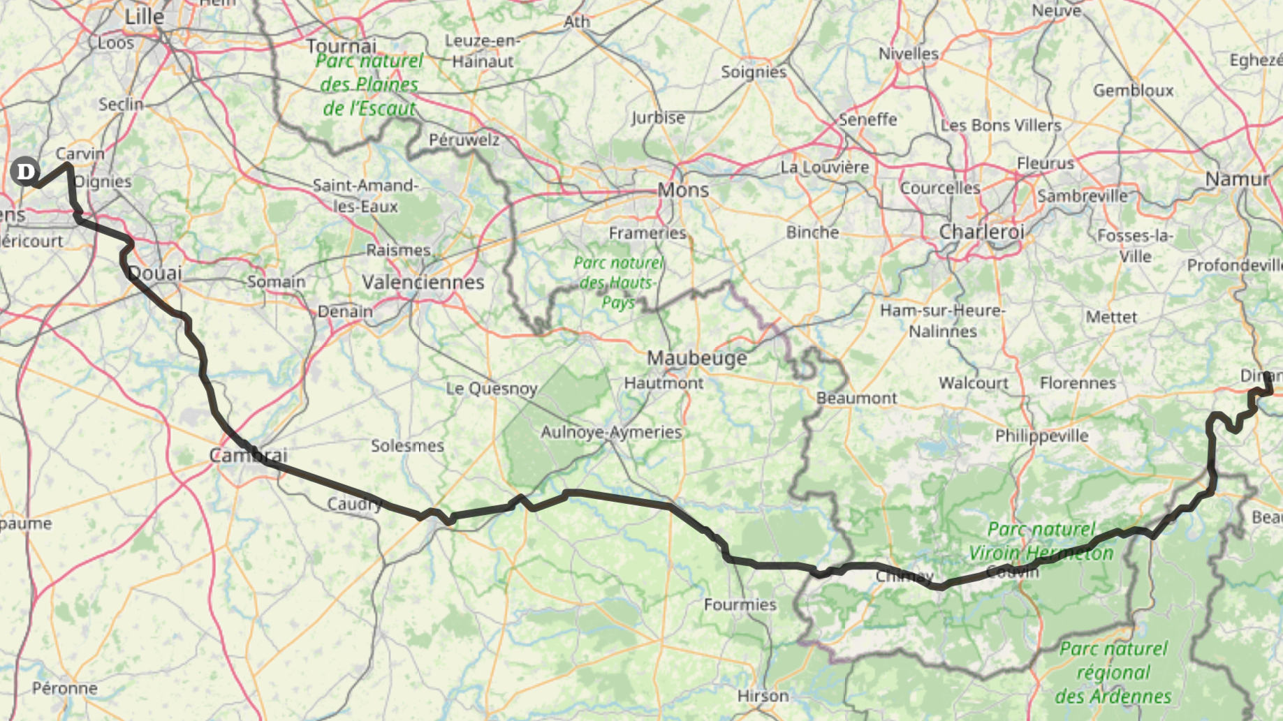 Ce 1e épisode couvre le matin du 1e jour. Au départ de Vendin-le-Vieil (à côté de Lens, toujours 🙂), j'ai pris la route (et toujours pas d'autoroute), en direction de Chimay puis Givet et Dinant.