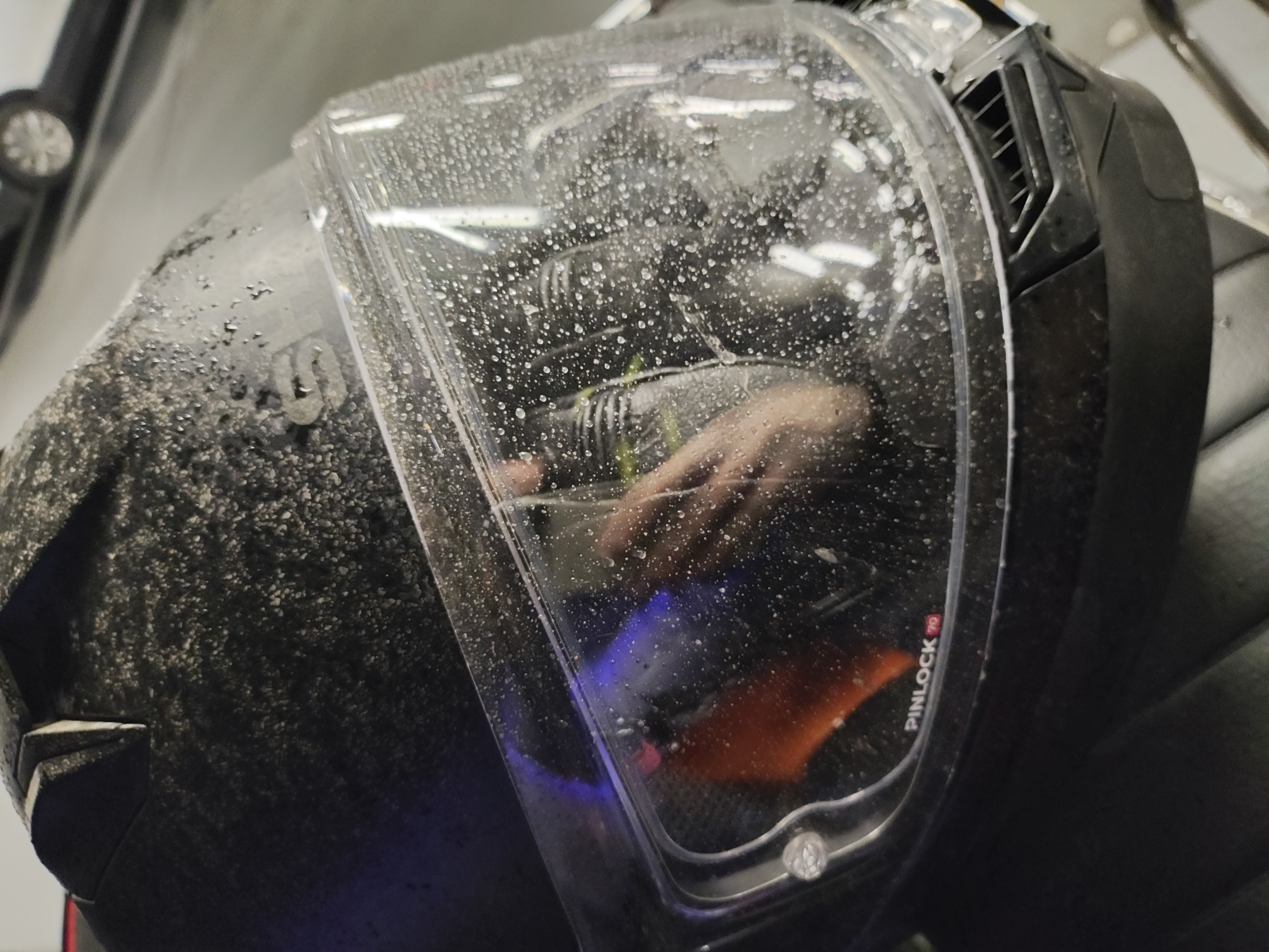 Ni une, ni deux, ni trois, ni quatre, ni cinq, ni six, ni sept, ni huit, ni neuf, ni dix, ni onze, ni douze, ni treize, ni quatorze, ni quinze, l'un d'eux alla chercher un produit nettoyant et un chiffon microfibre pour faire briller l'ensemble du casque ! Je n'en demandais pas tant.