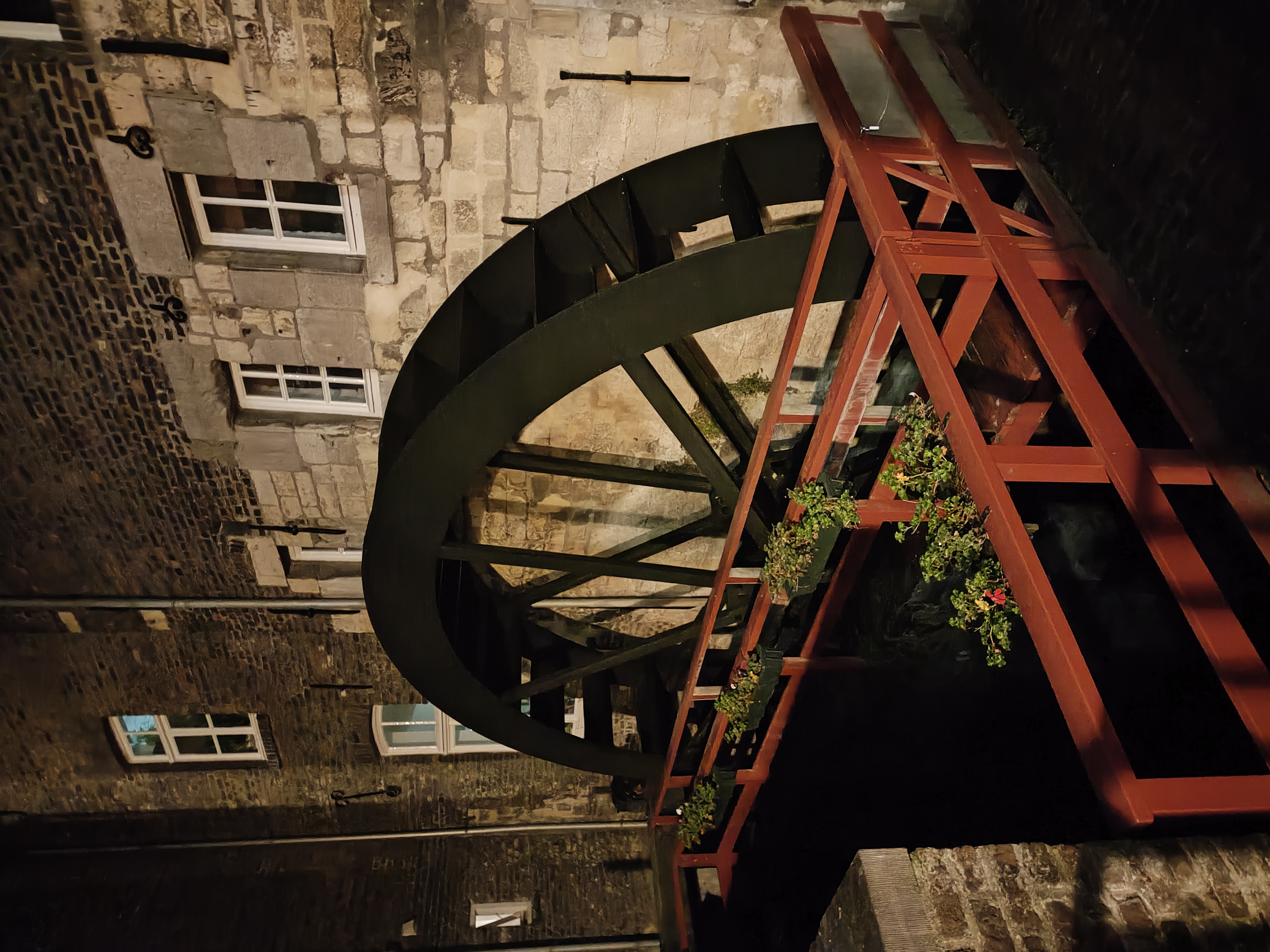 Ce moulin tient son nom de l'évêque de Liège qui en prit possession en 1099, à la mort de Godefroy de Bouillon, mort en croisade à Jérusalem. Construit au VIIe siècle, entretenu et amélioré au fil des ans, il est toujours utilisé de nos jours. En voici la roue à aube (bien entendu, il se visite, bien entendu, je n'ai pas pu le faire 😄) :