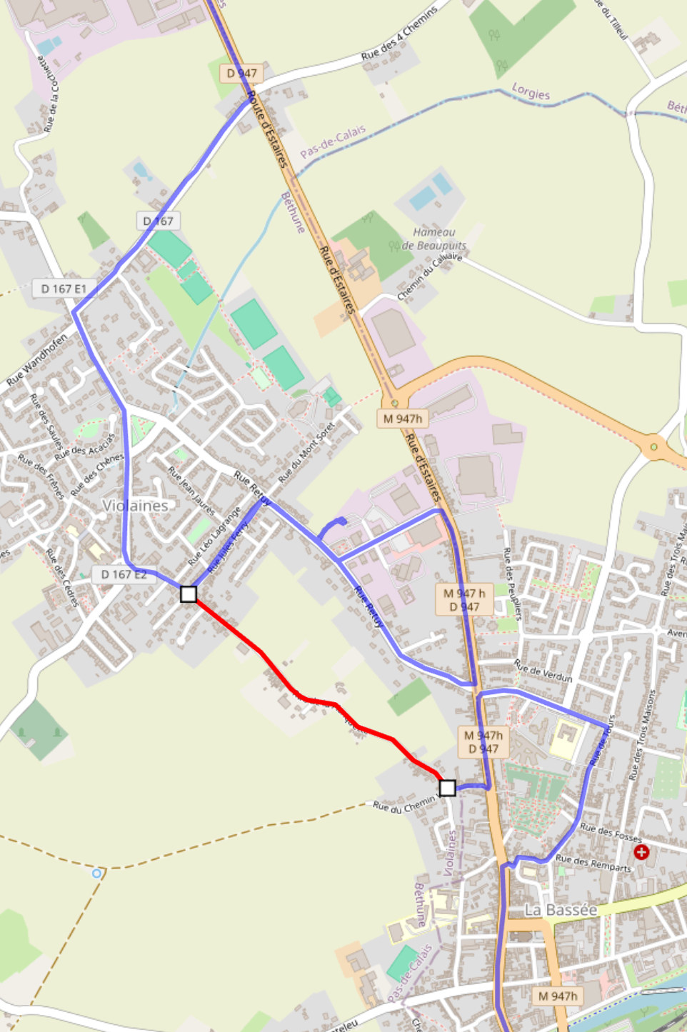 La rue d'Estaires était fermée à la circulation, et celle en rouge aussi mais dans un seul sens. J'ai dû prendre cette dernière, complètement défoncée, sans revêtement, avec la crainte de perdre la béquille, qui aurait pu finir dans ma roue arrière.